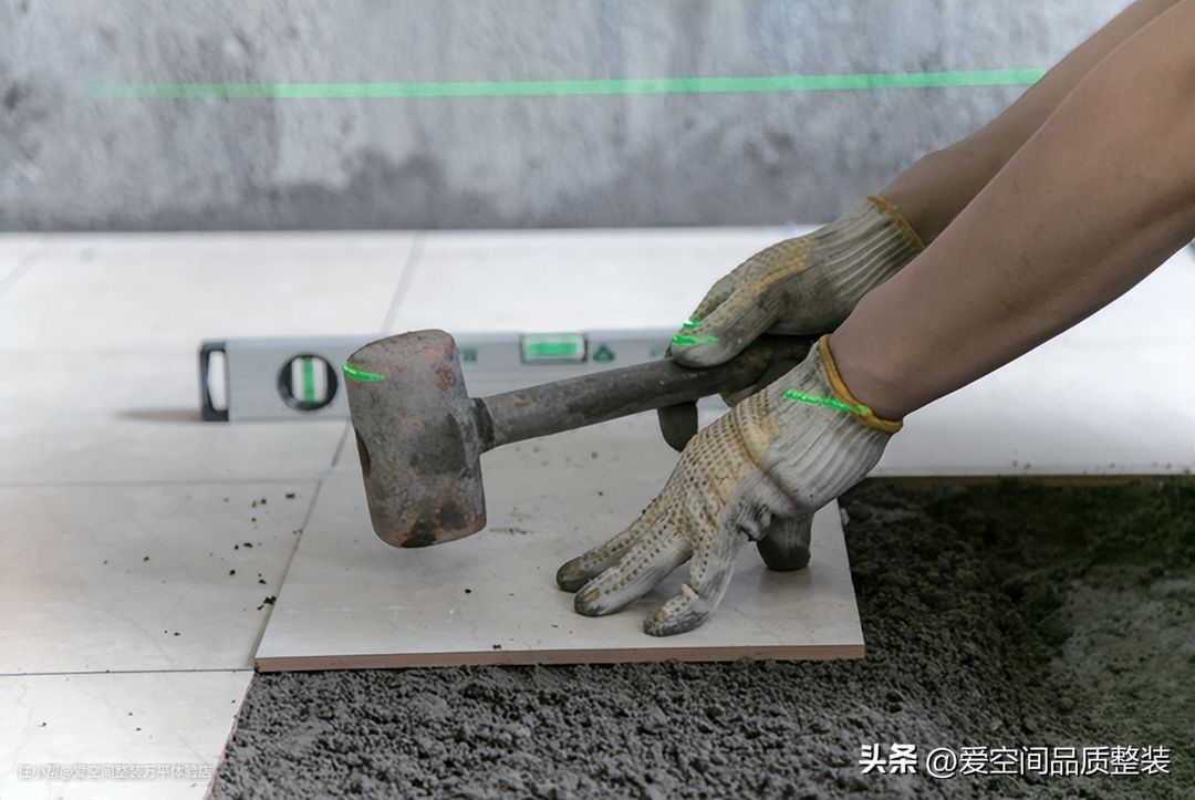 取一块浸湿后的地砖铺在砂浆上,用橡皮锤敲打至与标高线齐平。然后,将地砖取下来,查看下面的砂浆。如果存在缺少以及不平整的情况,则需要填补砂浆并将砂浆找平。
