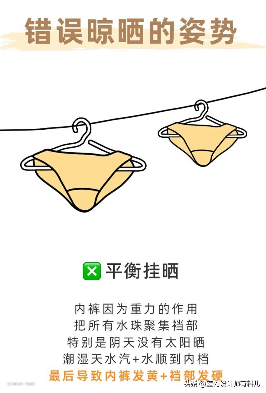 很多人平常都是平衡式挂晒,这样内裤因为重力的作用,水往下流,所有水全部聚集到了内裆部,特别是阴天没有太阳晒,水不容易干透,导致内裤发黄+裆部发硬。