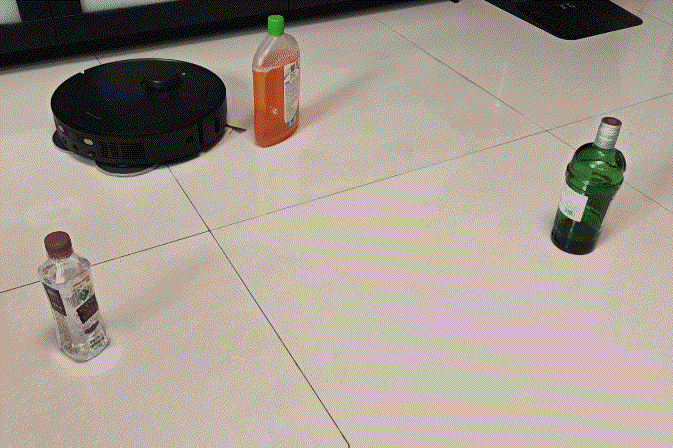 客厅清洁液、饮料、酒瓶等小物件来测试追觅X40 Pro的避障表现。实测可看到追觅都很轻松避开障碍物继续自己的清洁任务,同时会靠近障碍物的边缘进行清洁。逻辑上来说能够很好的规避障碍物,同时又不会为了过度避开障碍物而造成漏扫,这个避障表现还是很厉害了。