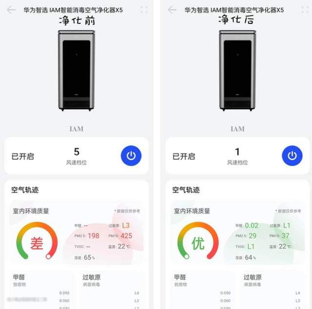 各类物质燃烧后都会产生烟雾,这些烟雾中含有大量硫氧化物、烷烃、醛类、细微颗粒物、异味气体等有害物资。通过开启华为智选IAM X5进行室内净化,可以有效检验机器的甲醛、PM2.5、PM10和TVOC的净化能力。二狗使用华为智选IAM X5自带的检测系统进行数据测试,测试场景为20平左右密闭的房间,观察屏幕参数变化。初始状态空气质量为差,甲醛无读数(才开机状态下无法正常测量甲醛),PM2.5为198,PM10为425,过敏原等级为L3,TVOC等级无读数(才开机状态下无法正常测量TVOC)。经过18分钟后,空气质量为优,甲醛为0.02,PM2.5为29,PM10为37,过敏原等级为L1,TVOC等级为L1。从实测数据可以看出,华为智选IAM X5可以支持多种有害物质的净化,整体的净化效率也是比较高的,并不算小的房间在18分钟内就从空气质量很差的状态恢复到优秀的状态。简单来说就是,一台华为智选IAM X5就可以快速搞定房间的各种空气净化工作。