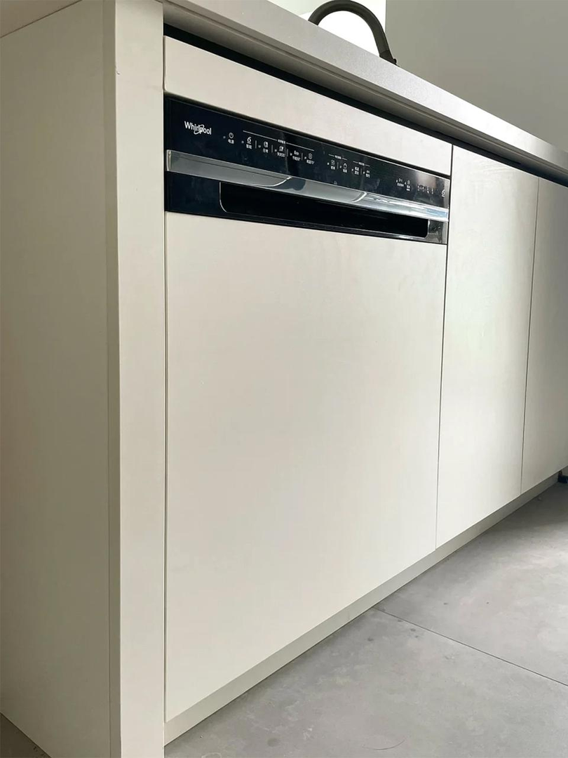 全嵌式:洗碗机自身不带门板,操作面板在门板内侧上沿。门板需要联系橱柜商家定制,或直接购买带不同配色门板的机型。全嵌式会将洗碗机全部做隐藏处理,整体感更强更美观。