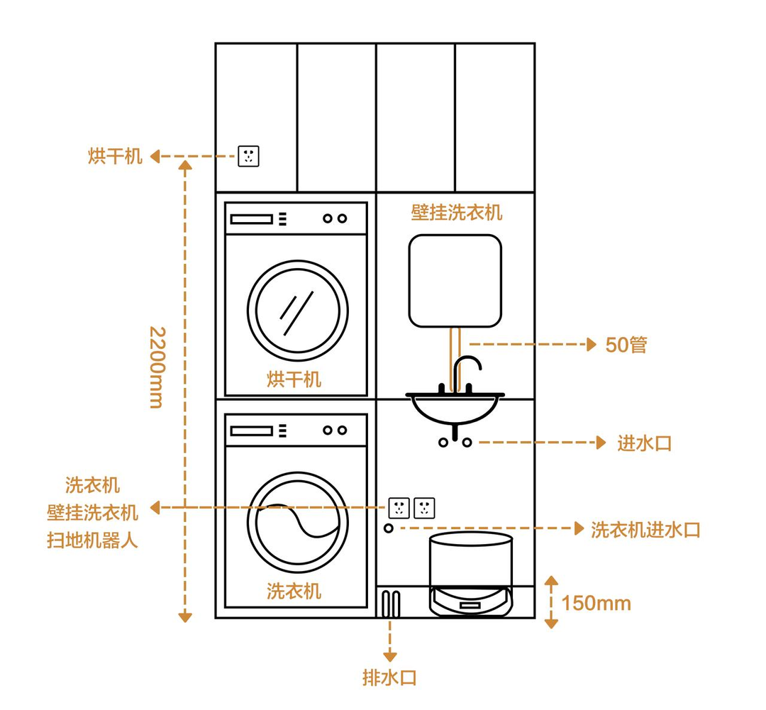 排水口应预留于洗衣机旁边,如果跟水盆共用一个排水,需要做反水弯。墙排水高度建议30~60厘米;排水如需穿隔板打孔,孔口应高于排水口5~10厘米。