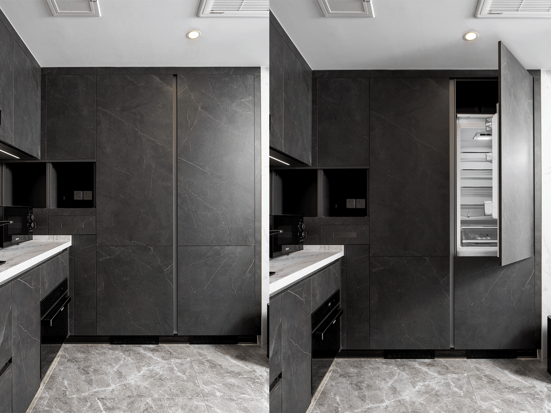 ④全嵌:冰箱能整体融入柜门中,做好真正的“一体化”。冰箱门外需另外配橱柜门板。