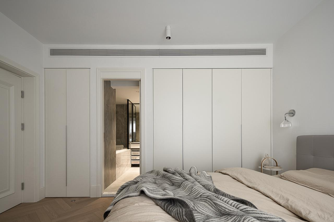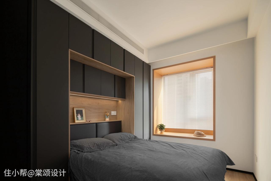 对于空间有限的次卧或者小卧室来说,舍弃传统床头背景墙设计,打造嵌入式床头,就可以拥有更多储物空间+床头柜+装饰效果。