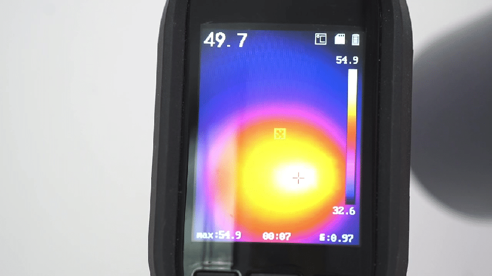 我还用红外热成像仪测试了这把吹风机的风温稳定性,将吹风机对准墙壁约15cm左右,开启最大风量,选择55℃暖风模式,待温度稳定后,通过红外热成像仪器测试墙壁温度一段时间,这样就可以很直观的得到结果了,从测试结果看,这把吹风机的风温控制得非常不错。