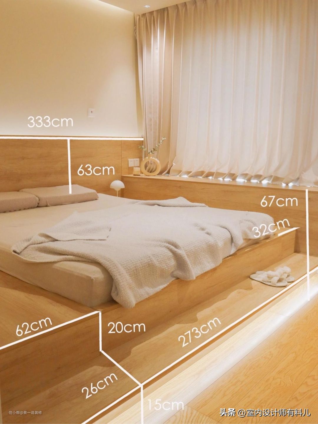 地台床很有日式氛围感,又有超大储物空间,地台中间放床垫处可以设计成床榻区,将200cm*180cm的床垫卡进去,这样内嵌后在床上怎么翻滚床垫也不会滑动。