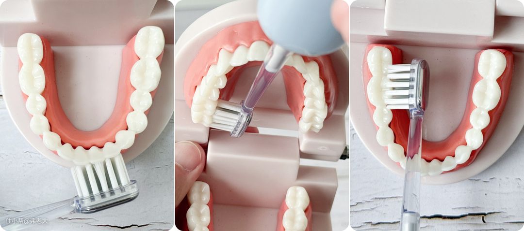 更重要的是,配备进口杜邦刷丝,仔细观察可以看到,刷丝端部是质地柔软的尖丝,直径细至0.02mm,能为牙齿、牙龈提供更周到舒适的刷牙感受,轻柔呵护每一课牙齿、每一寸牙龈,让我们打心底爱上刷牙。楼主用仿生牙模模拟刷牙,无论哪个分区位置、外侧或内侧齿面,标准护龈刷头都能完美贴合,无遗漏空隙。