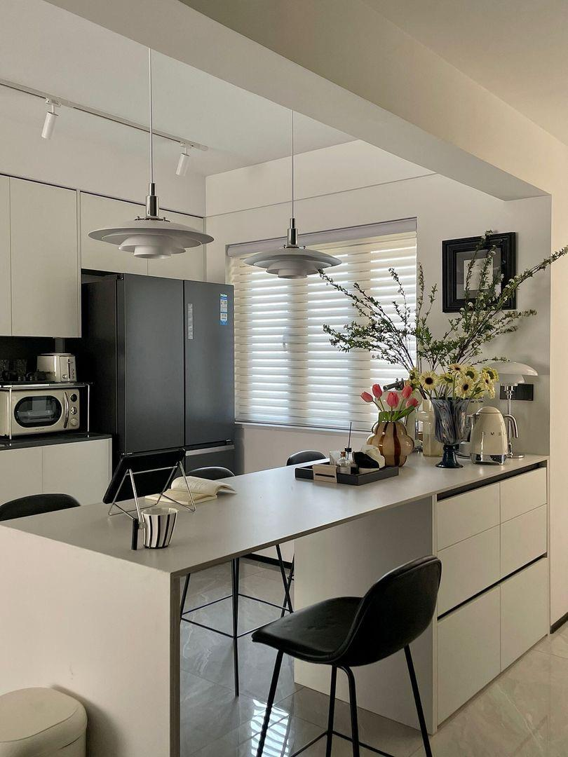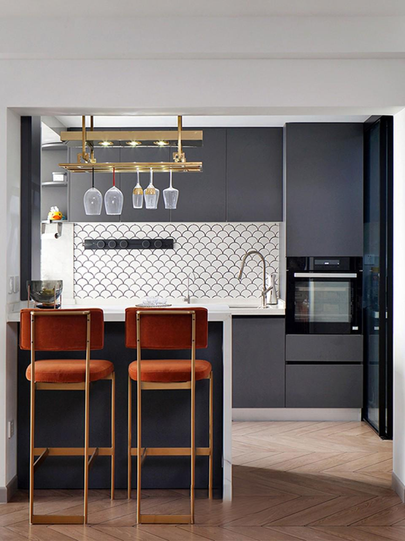 小户型非常适合做半岛设计,洗涤、用餐功能兼备,操作动线十分流畅,在岛台上洗菜备餐,转个身就能烹饪,此外延伸出的吧台区域,可以增加与家人之间的互动。