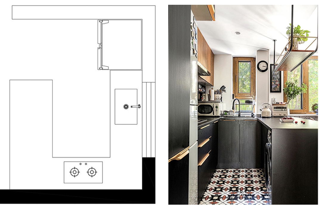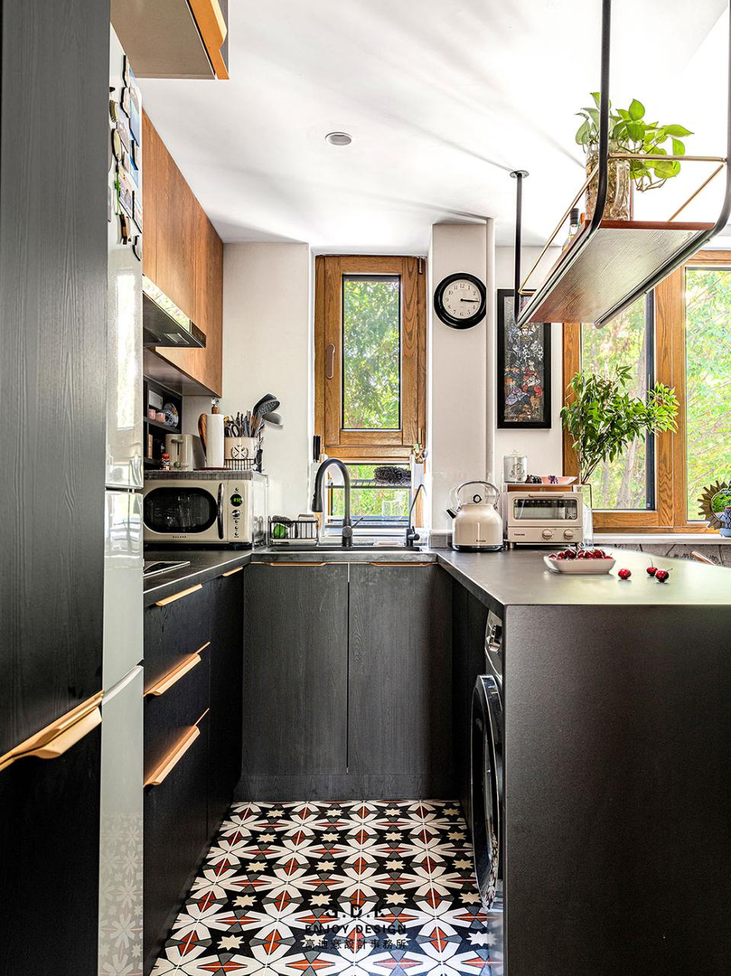 如果厨房受房型和面积所限,则可以倚靠一面墙或橱柜,形成一个半岛台,提升厨房的使用功能。