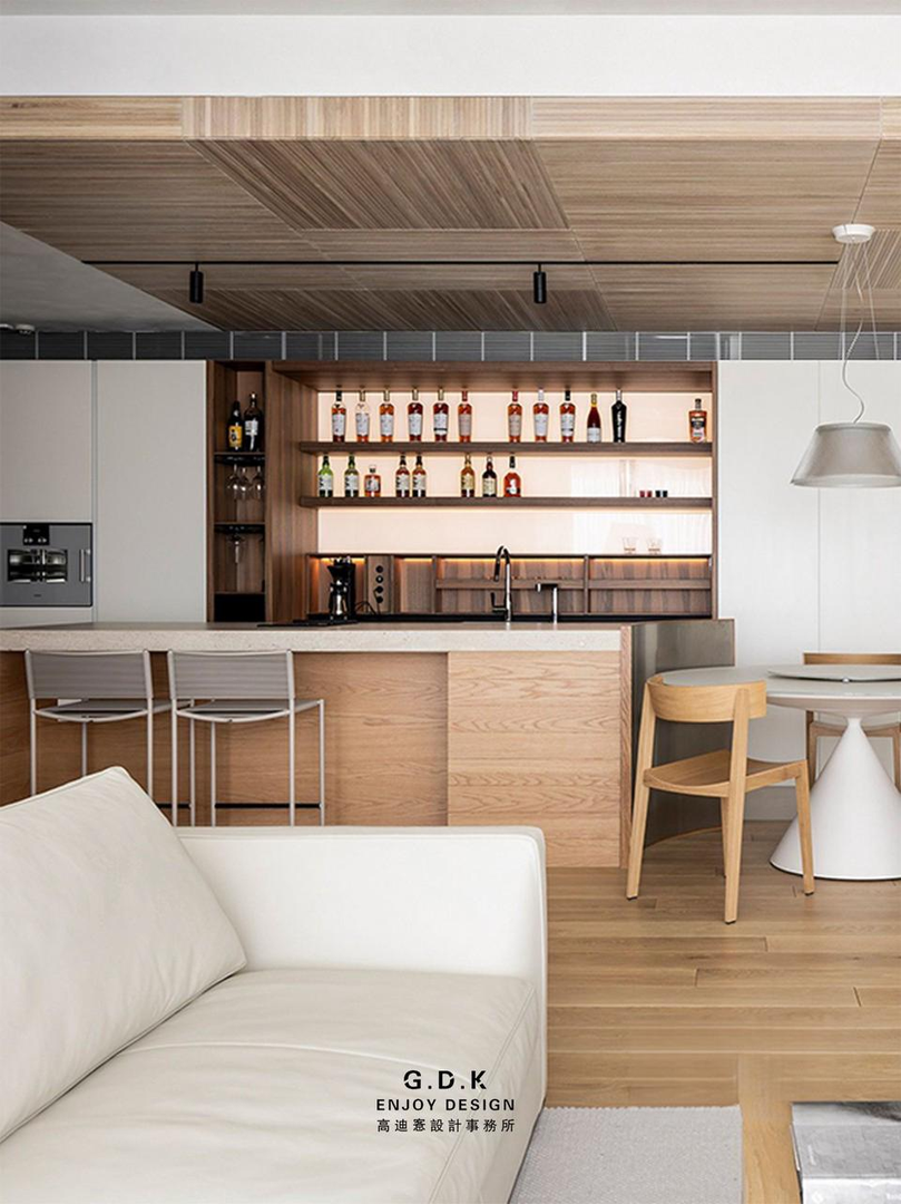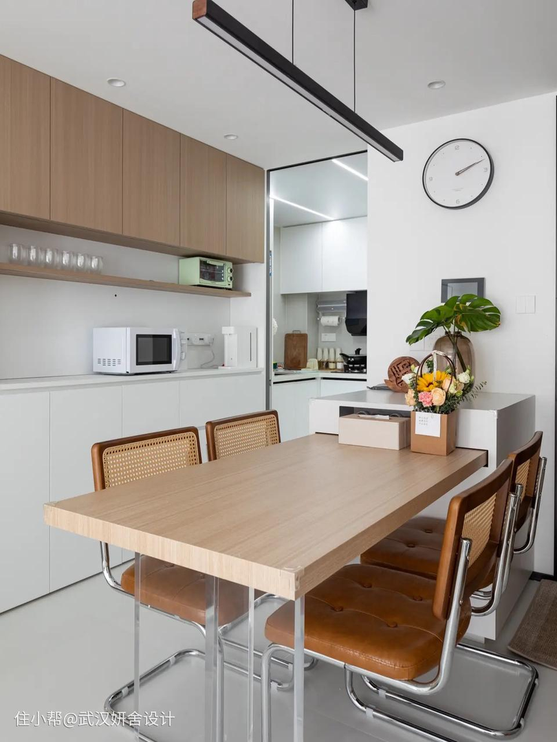 木质岛台和木地板搭配,非常适合温馨的原木、日式、田园等风格,木质元素可以作为局部使用,运用在台面、餐桌、或者柜体, 组合拼接的方式非常耐看。但时间长了容易开裂长霉,不易清洁。