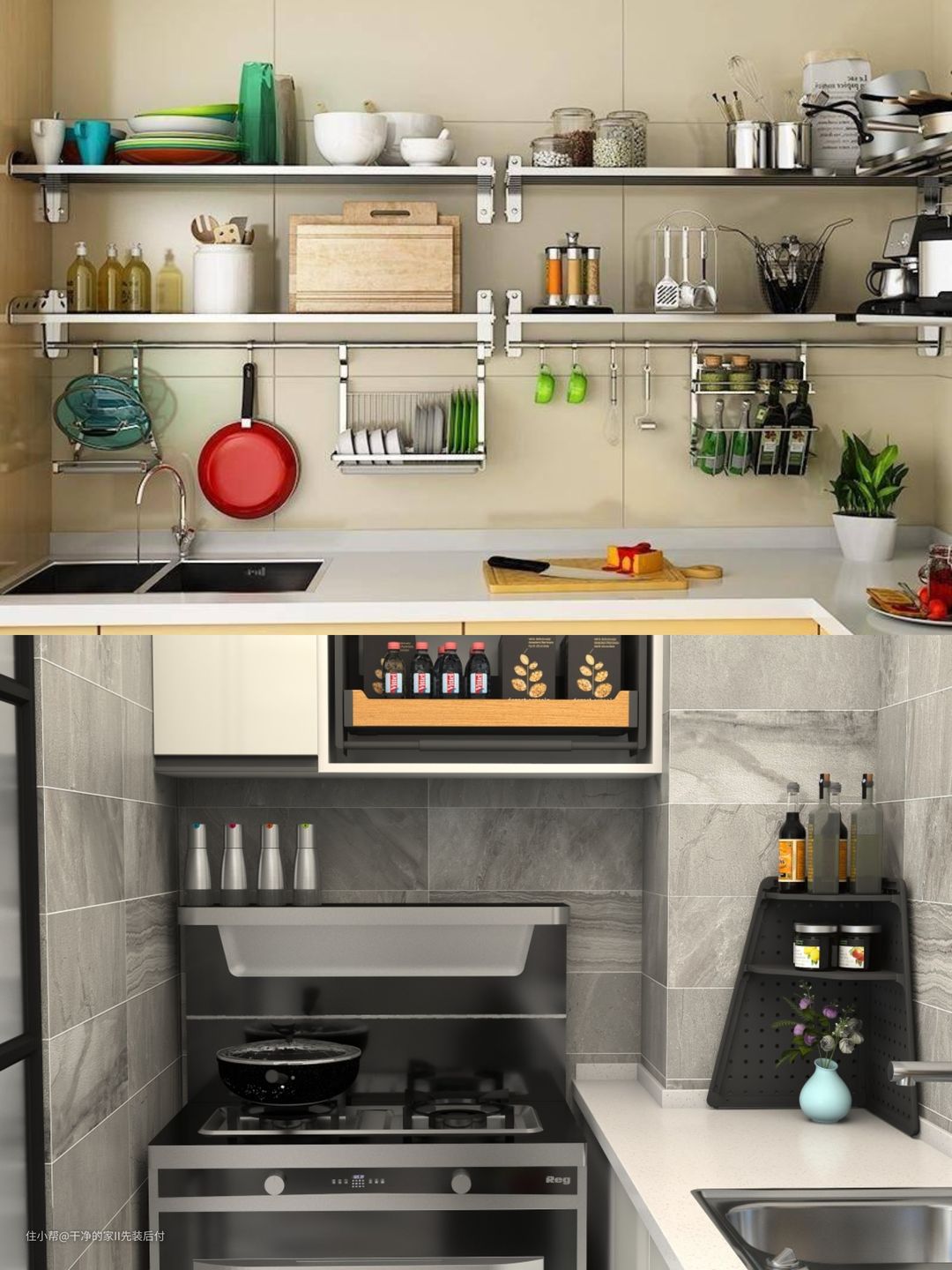 2. **利用墙面空间**:安装壁挂式架子、磁性刀架或者悬挂式锅具架,可以有效利用厨房墙面,节省台面空间。