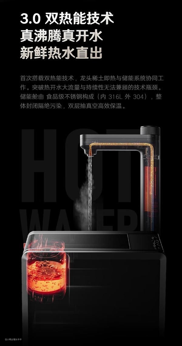 ‼ 注意,【双膜加热】这个【膜】不是指【RO膜】,而是【稀土】,做加热用途的那个膜。一道膜安排在即热龙头里,另外一道膜安排在热罐里。