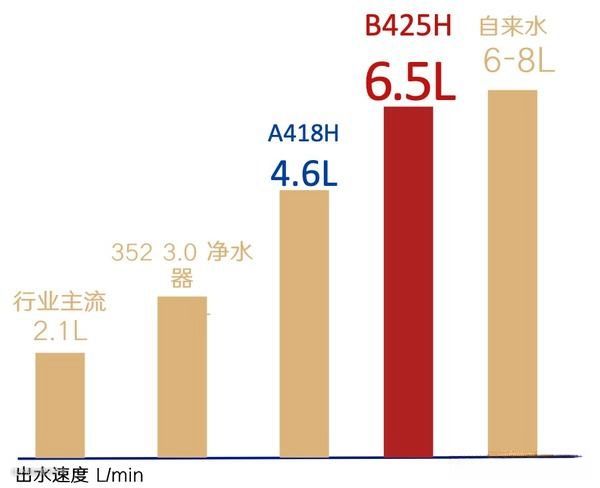 它的冷水流速大大提高,从A418H的4.6L/min进化到了6.5L/min,在目前的净水行业绝对是站在山顶唱歌的那一位,根本找不到对手。