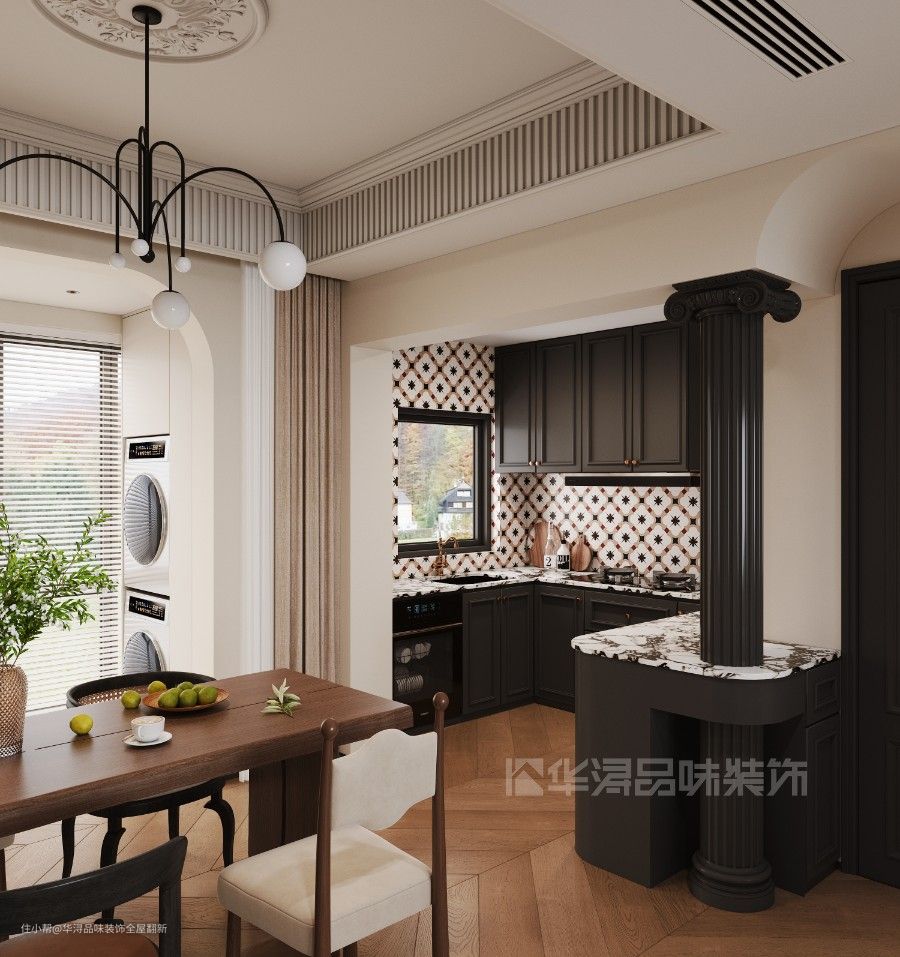 厨房墙面铺贴小花砖,自带复古氛围,呈现出更为丰富的视觉效果,与黑色橱柜碰撞出典雅摩登的空间气质。
