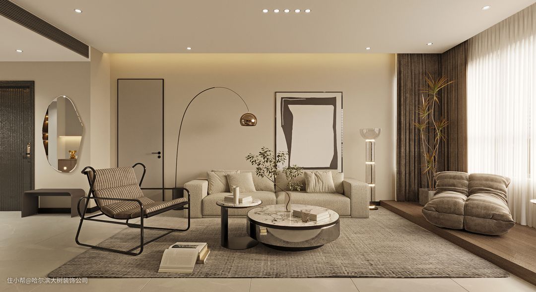 这大概是90后都无法拒绝的一种风格吧?软硬装重点在色系的选择上,基本上以低饱和度的驼色系与米白色为主,整体硬装简单干净,软装家具又细腻温柔、质感高级。灯光上可以选择氛围感十足的无主灯设计,更加立彰显软装材质的肌理感。