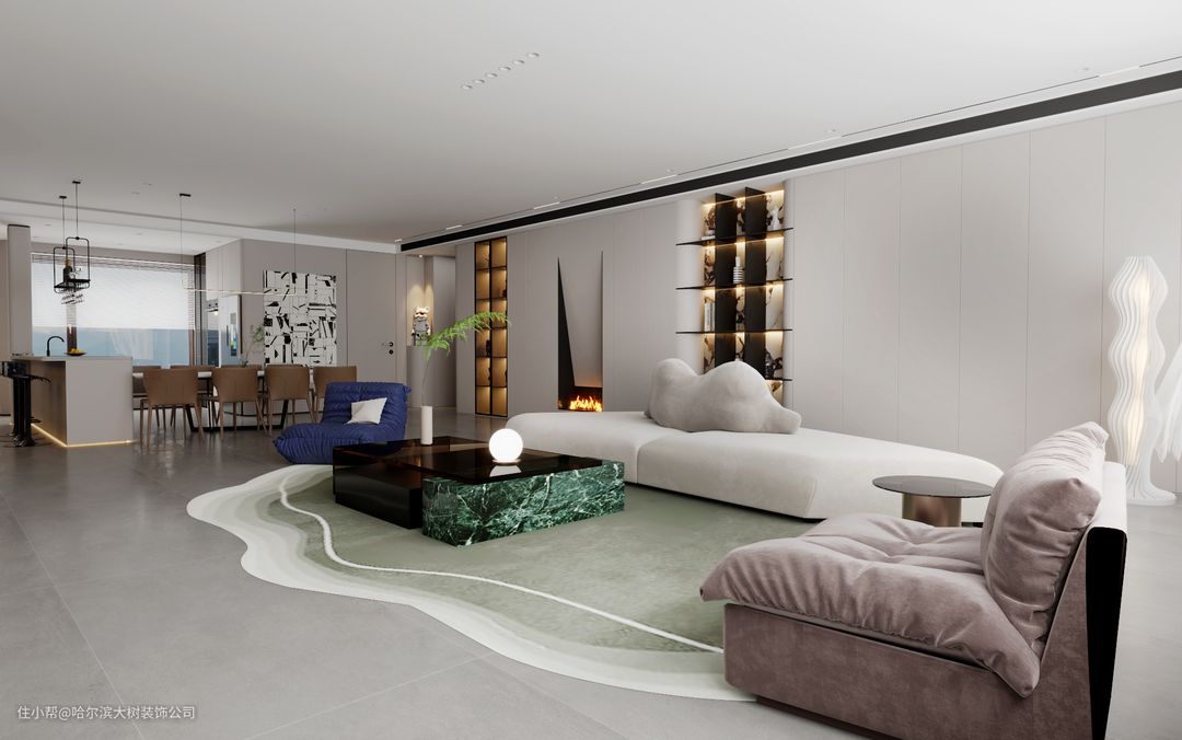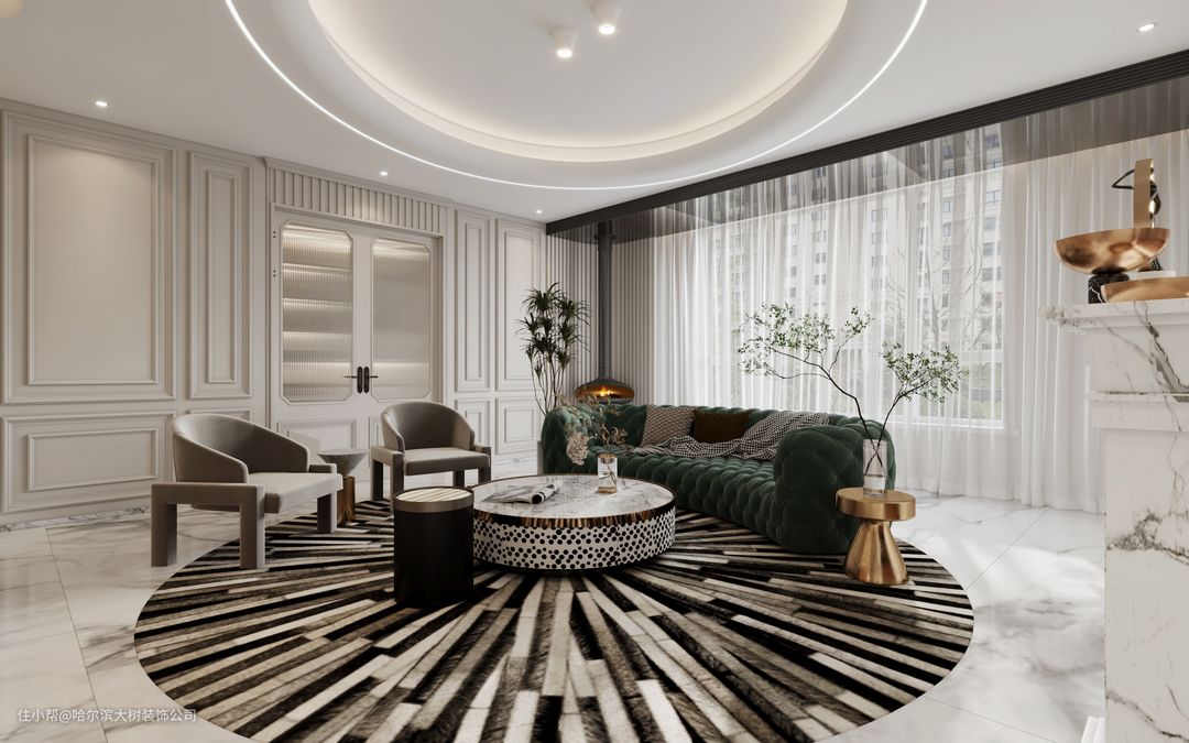 意式现代风整体设计元素较少,但是又不会像现代简约风那样随意,斑马纹怀抱椅、自然纹理的地毯、古玩摆件、鹰皮沙发丝绒抱枕,精致体现在软装细节之中。