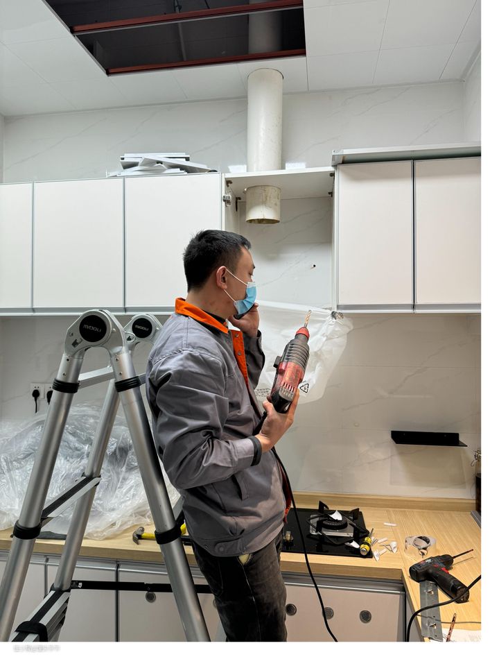 如果你家之前就有橱柜了,可能会出现像牛牛这里一样的情况——烟机和橱柜之间会留有一段缝隙的情况存在,不能确保烟机和橱柜处于完全平行、契合的状态。
