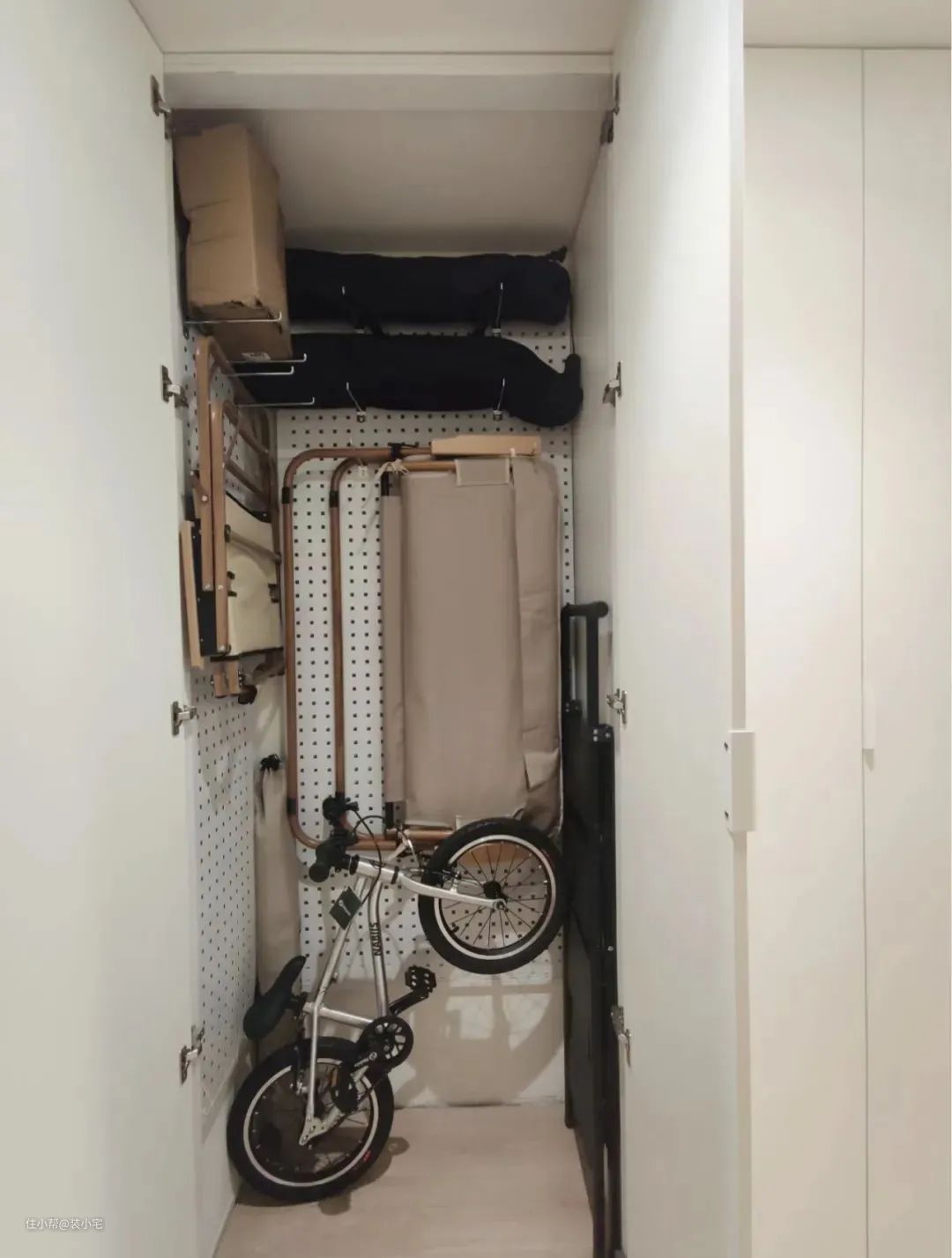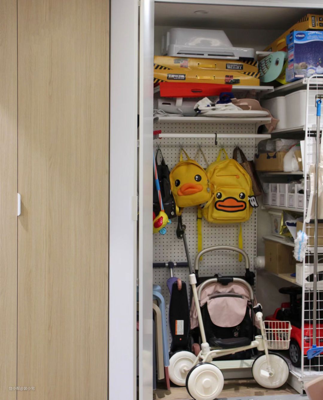 在储物间里,我们可以放弃传统的定制柜体,选择使用金属支架和折叠门来搭建一个无底柜储物间。这样的设计不仅耐造,还能无负担地收纳各种大件杂物。对于有孩子的家庭来说,这样的储物无底柜无疑是收纳各类不易搬动的大件物品的理想选择。