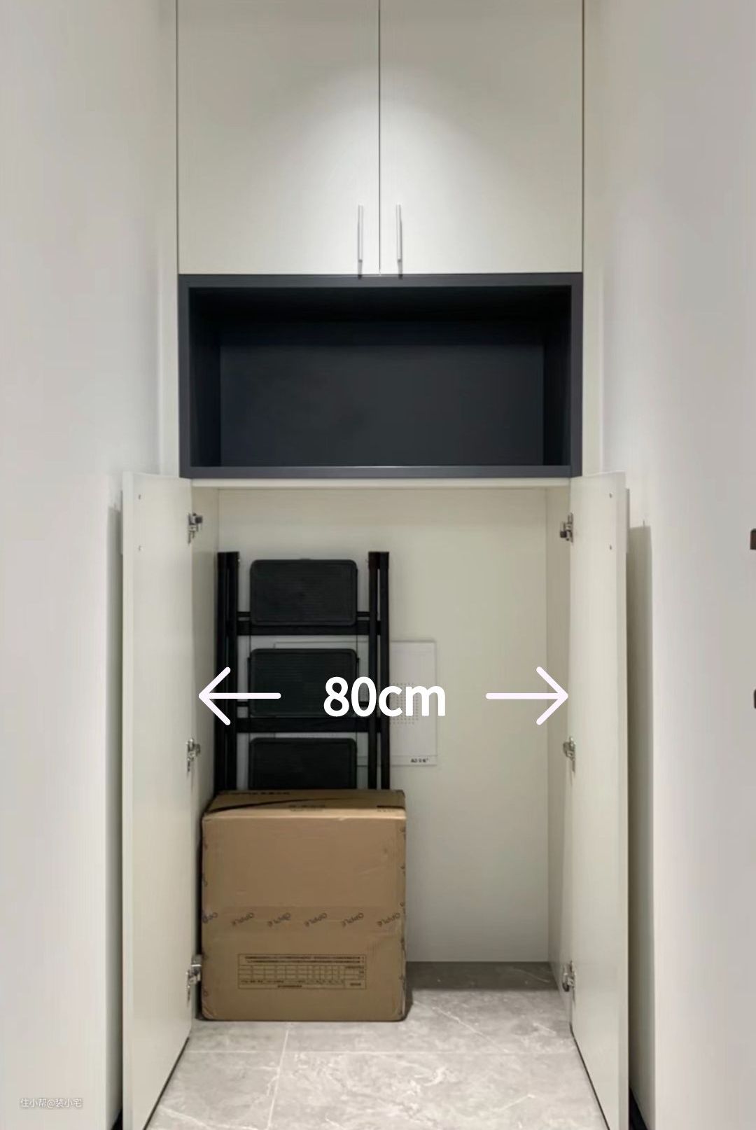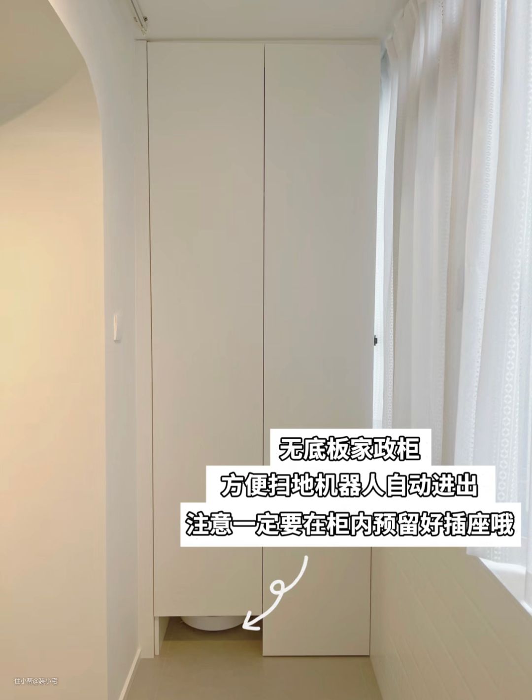 对于扫地机器人等家政设备,我们可以设计一个无底的家政柜。将扫地机器人放在柜子里,充分利用柜内空间。无底柜的设计省去了弯腰开关门和手动拿出机器人的麻烦,真正实现了去家务化装修。但需注意提前在柜内预留插座和上下水设施,并确保扫地机器人的柜门下方留出空间,以便其自由进出。