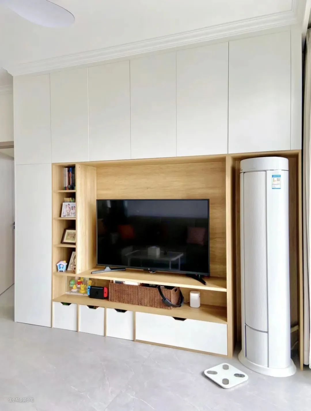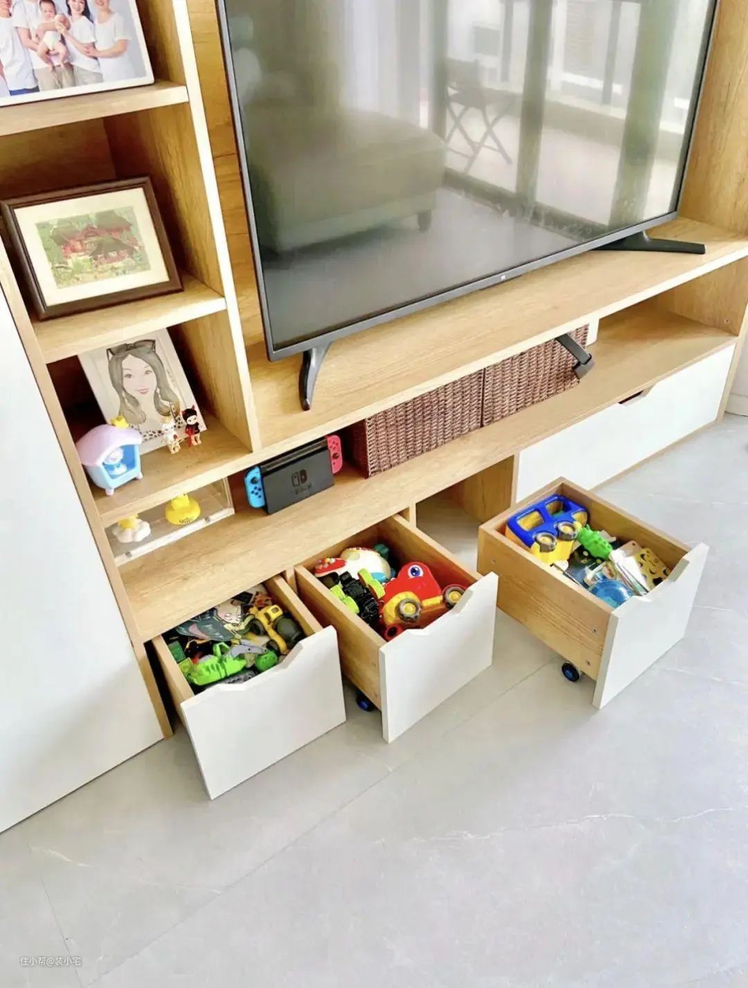 如果你家也安装了满墙的电视柜,那么可以尝试将下方的抽屉改造为带有轮子的无底玩具箱。这种设计不仅解决了孩子玩具的收纳问题,还能锻炼孩子的收纳习惯。而且,即使孩子长大后,这些万能的收纳抽屉也不会闲置。