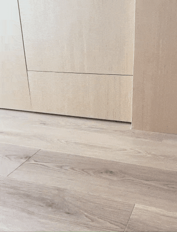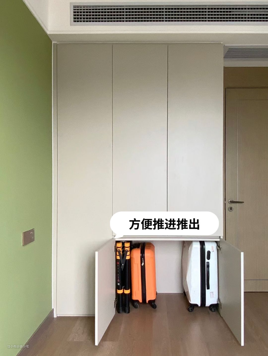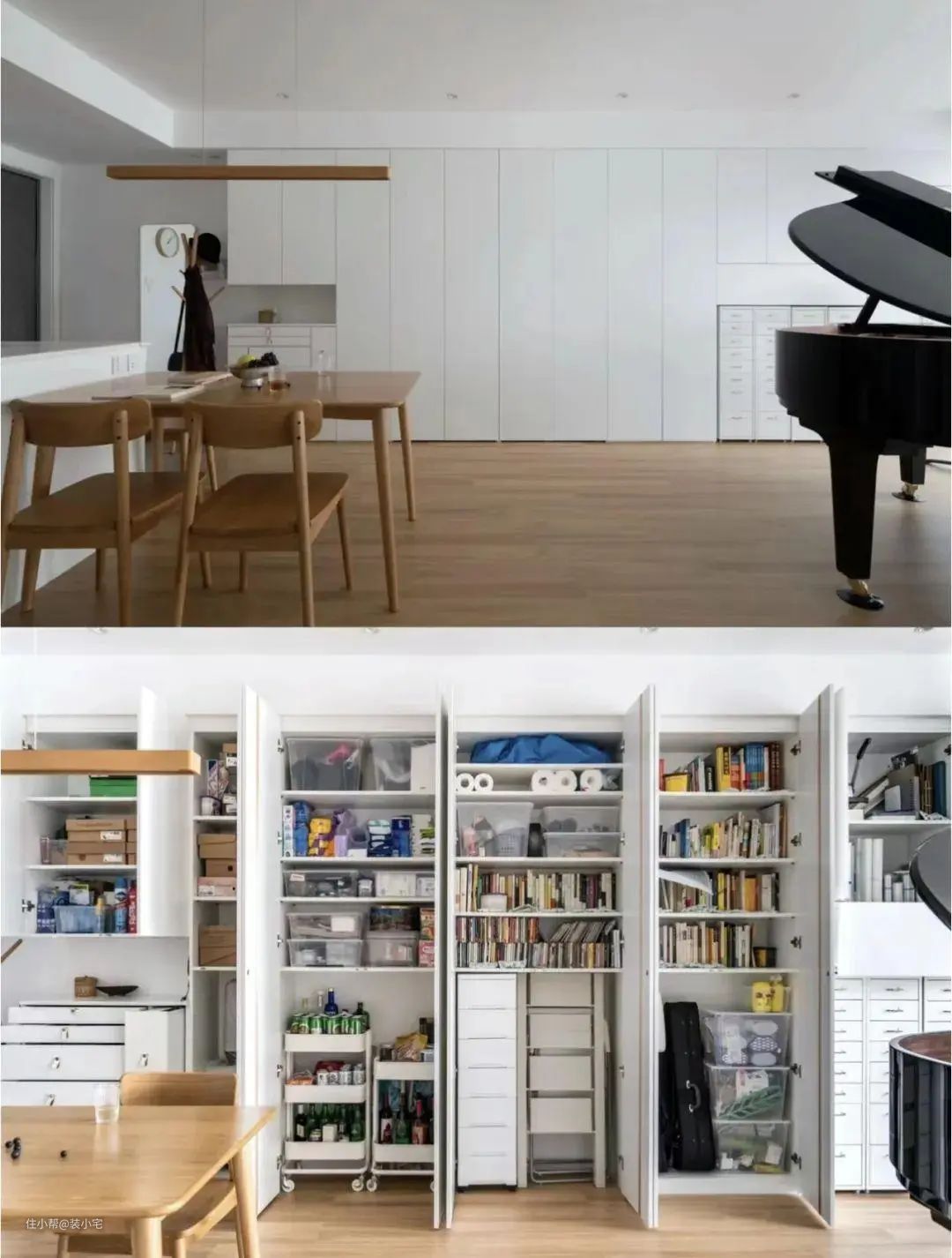 想象一下,在客餐厅一体的空间里,定制了一面满墙的收纳柜。其中,部分柜体设计成无底柜,搭配可移动的小推车使用,不仅方便收纳小物件,还能在必要时轻松“传菜”。另一个无底柜则用来存放大件物品,如家用梯子、行李箱等。这样的设计让收纳变得更加灵活和便捷。