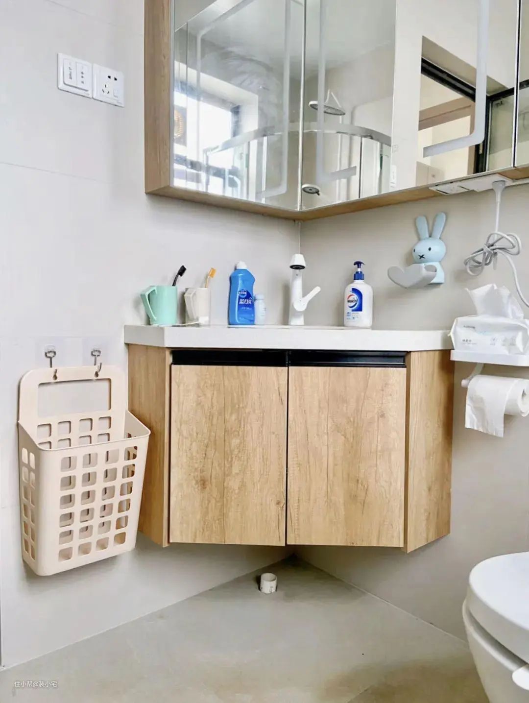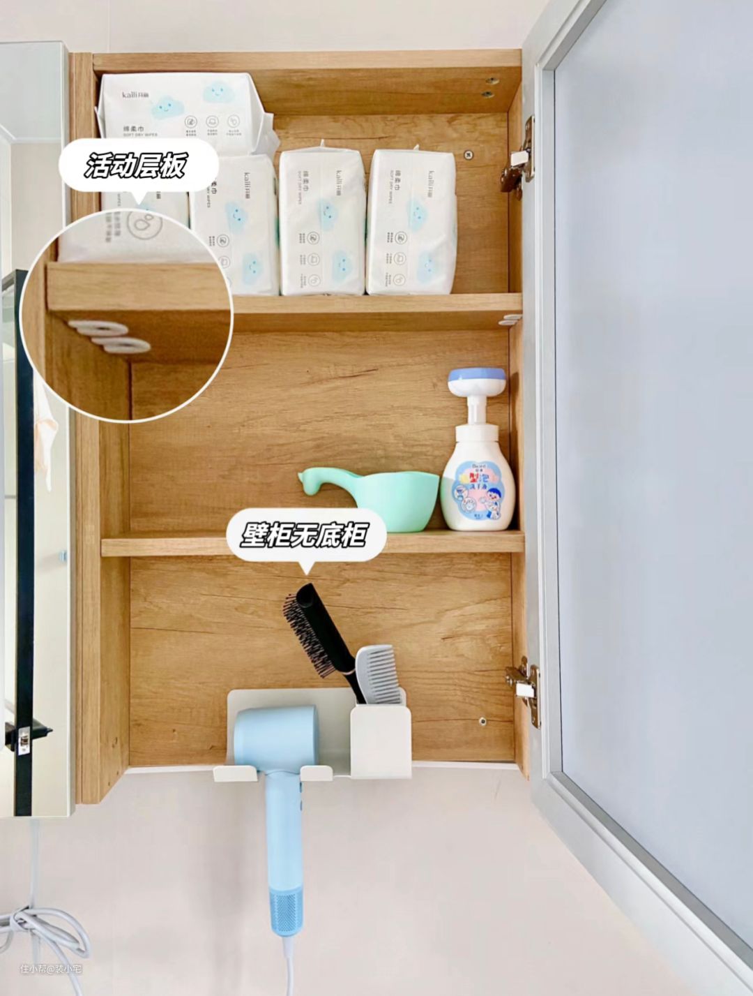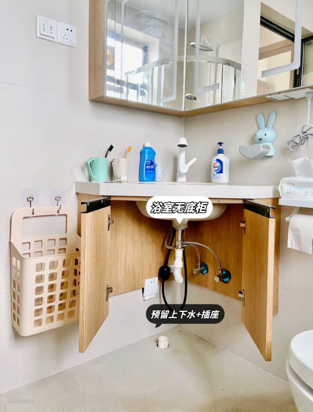 你或许想不到,镜柜也可以设计成部分无底柜。这样的设计可以用来悬挂牙膏牙刷,甚至隐藏吹风机等物品。它既通风不易发霉,又方便拿取物品,无需打开柜门。更有甚者,为了收纳扫地机器人和方便上下水,连悬空浴室柜的底板都可以省略。