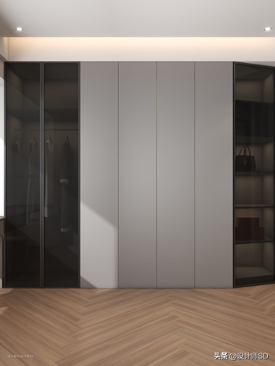 床对面的衣柜,则是一组六门的划分,左侧衣柜衣柜搭配玻璃门板,右侧的是一门到顶造型,很是简洁耐看,而且搭配上玻璃门的通透感,让大面墙的柜体看上去不压抑,却很是显得耐看高级。