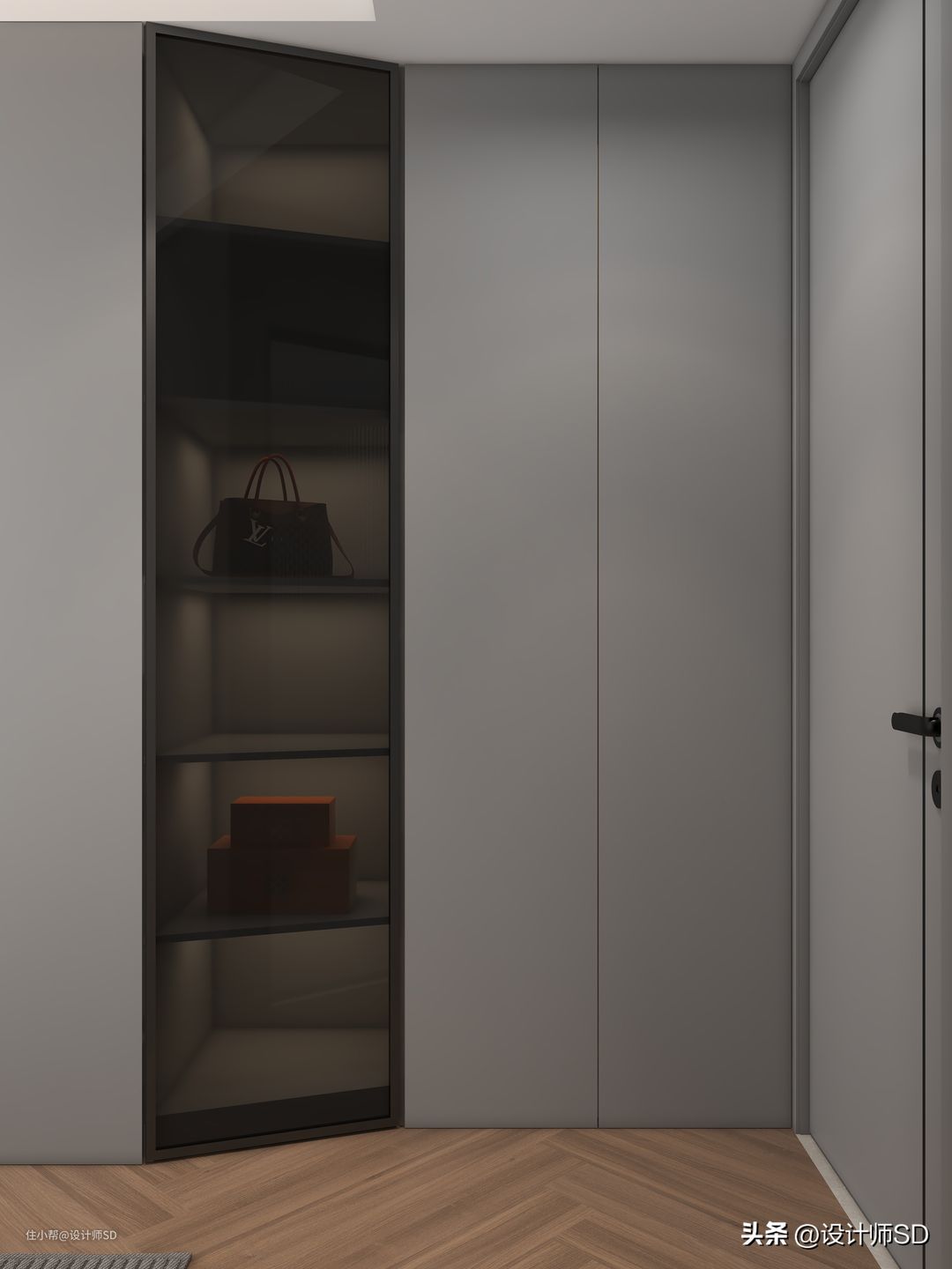 从房门右侧的空间,就是一整面墙的储物柜,由于过道的面积不是很大,一组薄柜与衣柜之间,穿插了一组斜边柜过渡,看上去衔接的很是舒适,而柜体内安装了柜体灯,可以放置一些精美的摆件与包包,搭配了黑色边框与灰色玻璃的门板。