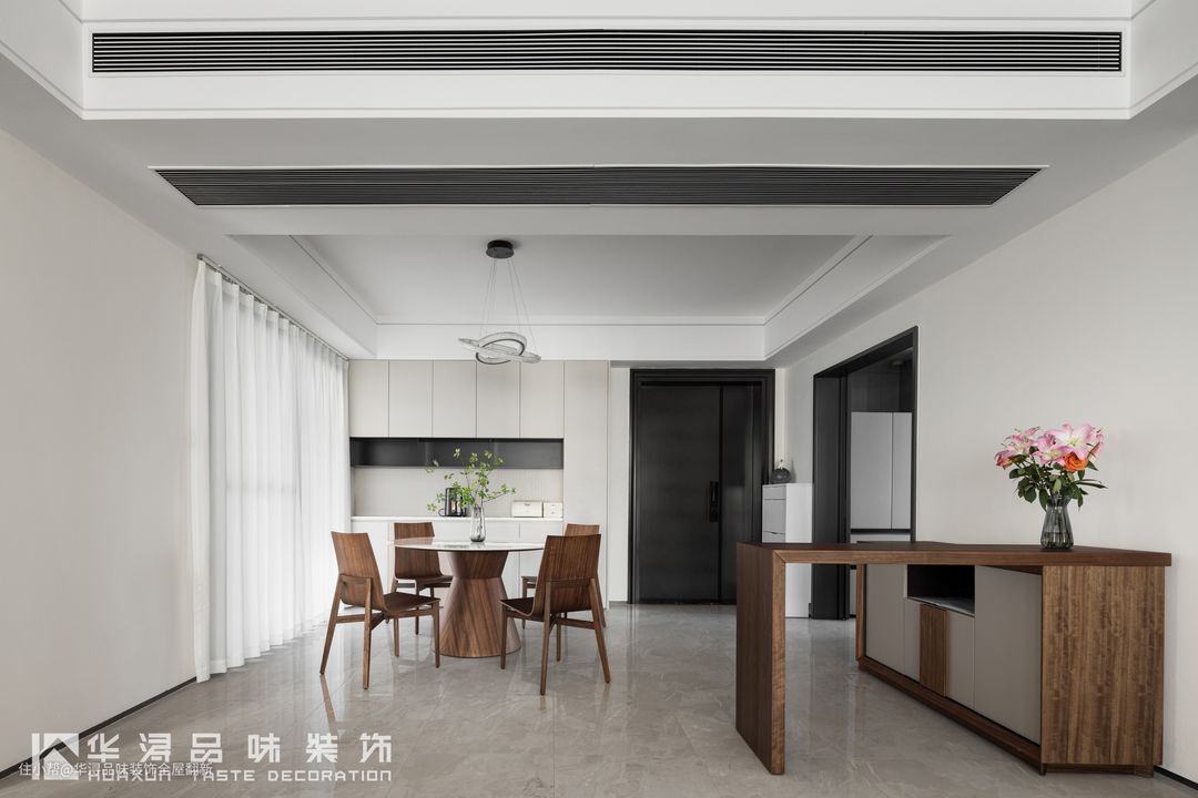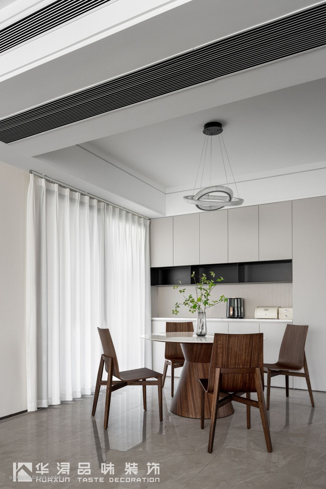 木质餐桌椅有着沉稳浓重的色调,散发出温暖惬意的安心感,在浅色调空间中成为视觉重点,塑造层次分明的空间质感。