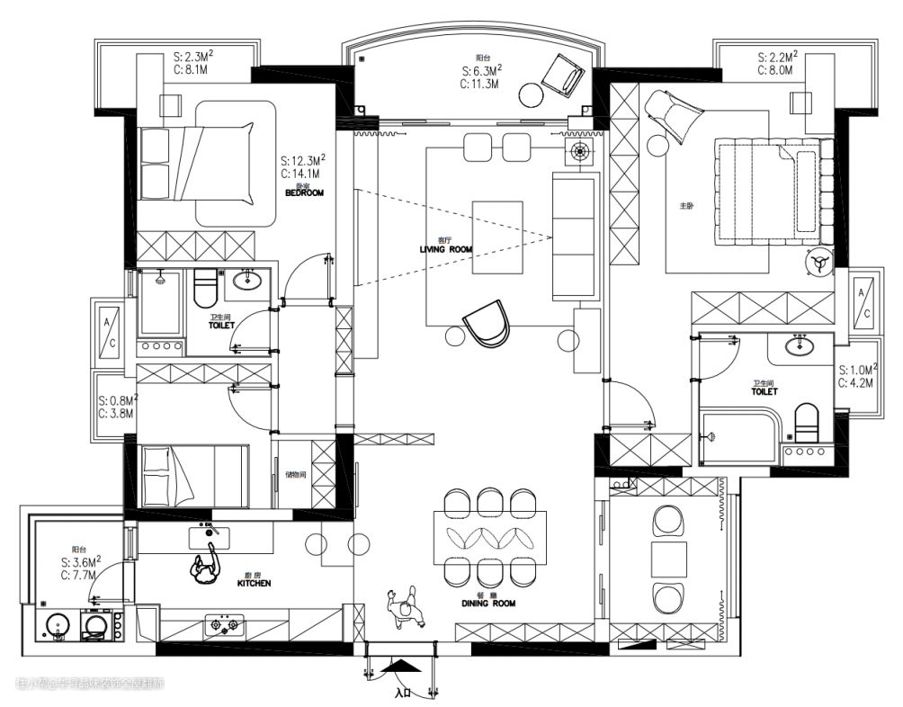 1.缩小其中一间次卧面积,增设储物间,增强整体空间的收纳能力。