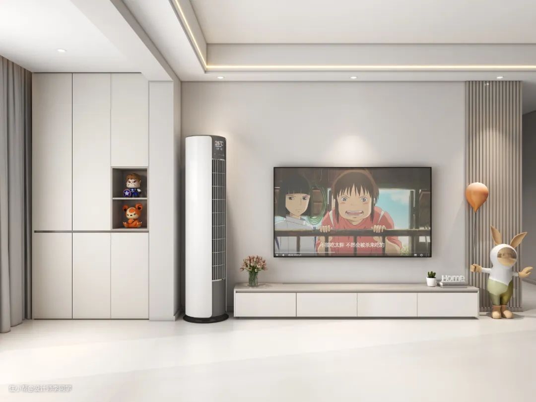 1. 客厅与阳台连通,这样客厅更显大,阳台打通做收纳柜,电视背景墙没做满墙电视柜也不做悬空电视柜,落地电视柜搭配木格栅,简简单单又好看;由于没装中央空调,空调柜机刚好放电视墙这边。