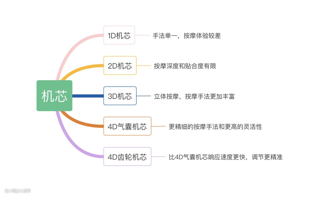 4. 4D气囊机芯:在3D机芯的基础上,通过气囊增加了空间轨迹的规划和执行能力,按摩头的运动能实现空间三个轴向上的协同控制,具备更精细的按摩手法和更高的灵活性。