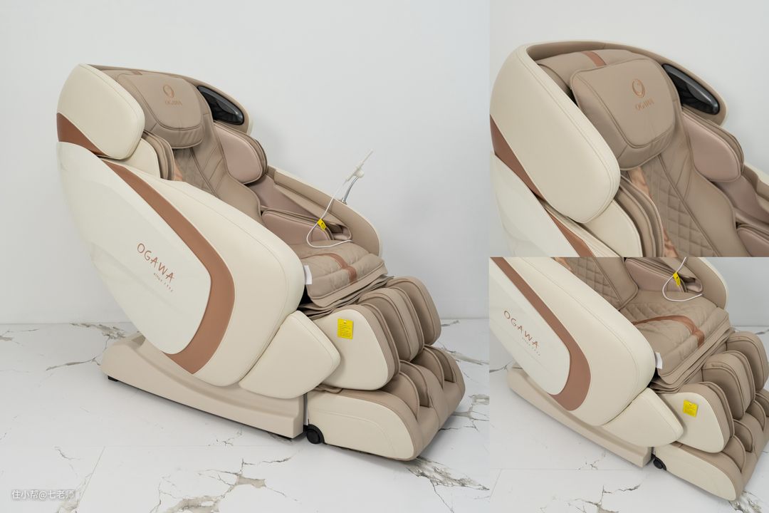 奥佳华7808:外观配色有金砂杏、骄阳橙和原木棕三种。外侧采用ABS塑料、荔枝纹和立体菱纹PU皮拼接,走线严密紧实,手感亲肤,细腻光滑。