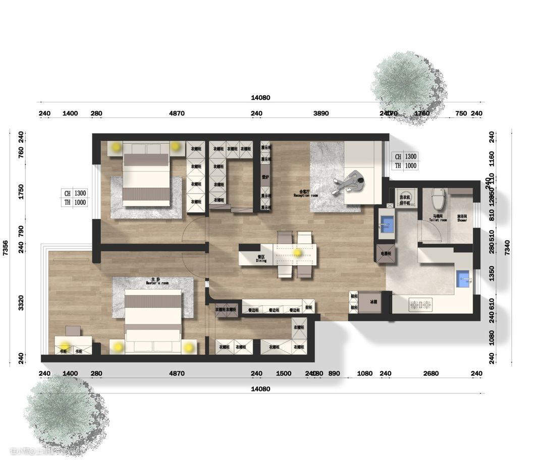 互换空间后,不仅实现了客餐厅在同一空间动线内,客厅与卧室的采光都比较充裕。稍微布置一下,感觉客厅充满了温馨感~