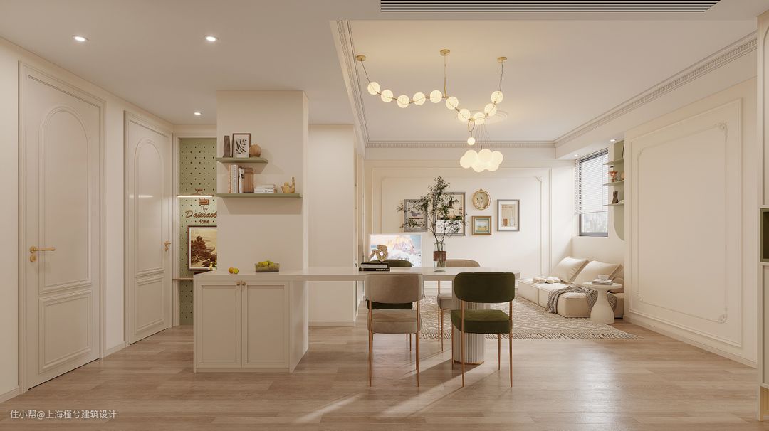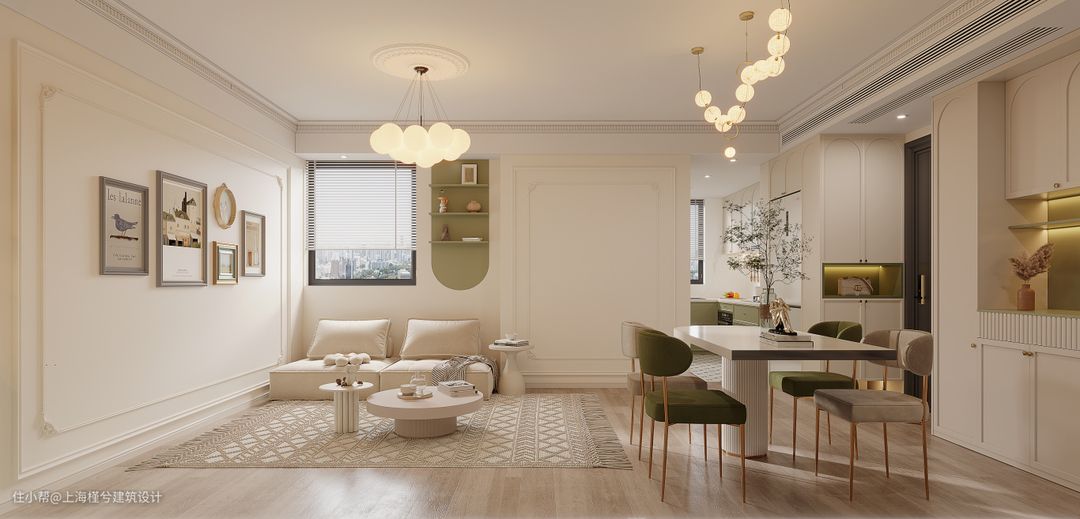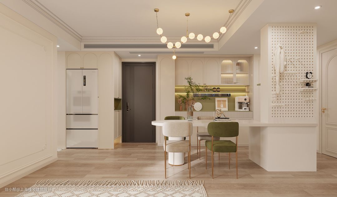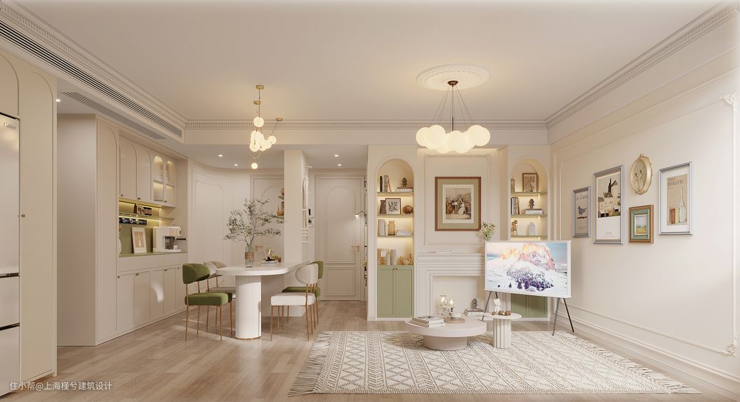 法式奶油风格浓厚的餐边柜,中间摆台设计了绿色💚清新脱俗,不易看腻~