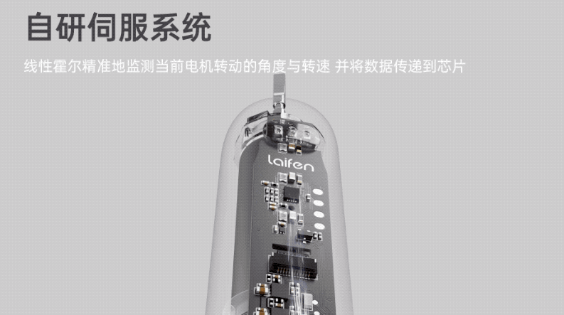 而徕芬自研的伺服系统,内置了两颗线性霍尔,精准监控无刷电机当下的转速和角度,然后将数据传给控制芯片,最后芯片计算出当前所需克服压力,所需功耗,输出给电机,让刷杆回到预设的角度,形成一个完整的控制闭环。