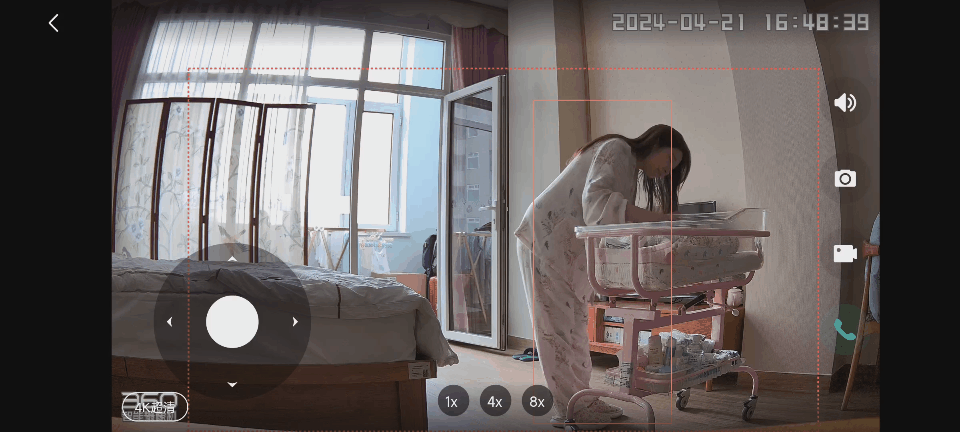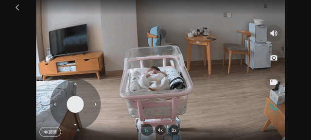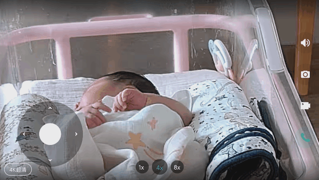 8 倍超级变焦:传统的云台摄像机只能一个固定视角,不能放大,离得远了看不清细节,如果想要照看宝宝就得把摄像头拿得距离宝宝很近。这样用起来很不方便!