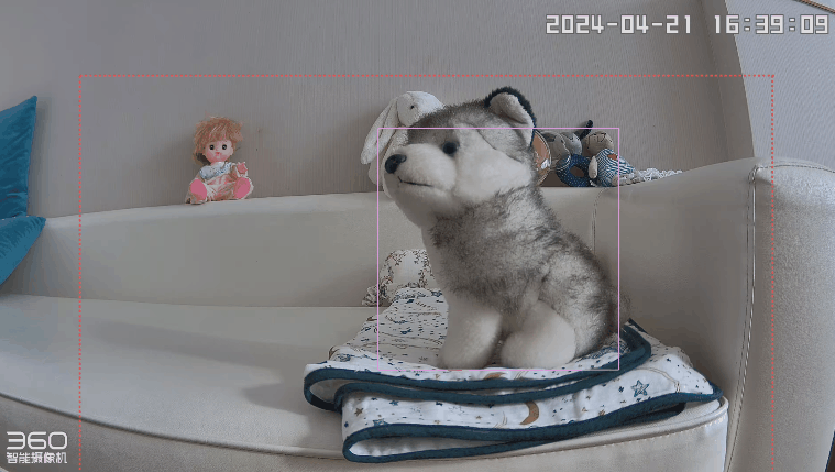 宠物识别技能:对于养宠家庭来说,360云台摄像机8Max 4K旗舰版可以非常精准地识别出宠物。与人不同,宠物是用紫色的框框圈出来的,非常明显。