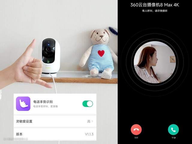 手势呼叫&电话手势识别:大一点的小朋友,会使用电话之后,就可以通过360云台摄像机来呼叫家人打电话。无论是对着摄像机张开手掌,比出一个“5”,还是对着摄像机比出一个“电话”手势,全都可以识别出来,直接发起语音呼叫。