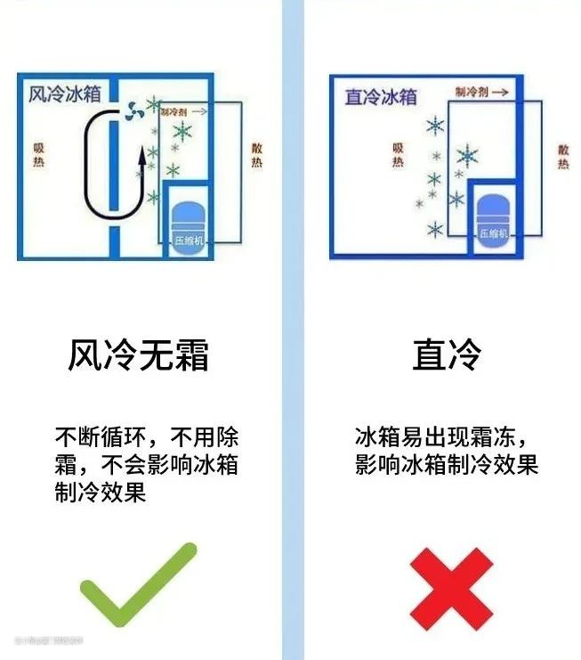 2、而直冷冰箱,采用自然对流散热,通过蒸发器直接降低冰箱内的温度,制冷速度相对较慢,需手动除霜。不然时间长了,会影响制冷效果和冰箱容量。