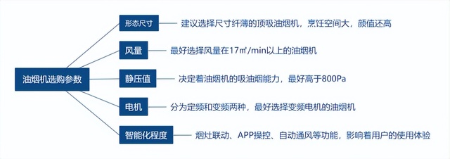 对于油烟机来说,其一共有五项参数需要我们在选购时注意,分别是形态尺寸、风量、静压值、电机和智能化程度。