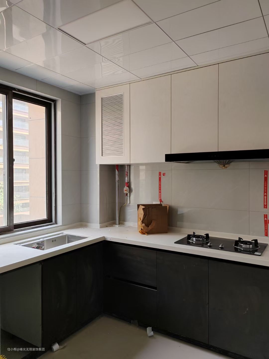 厨房橱柜上下分色,上橱柜是浅色,下橱柜是深色。