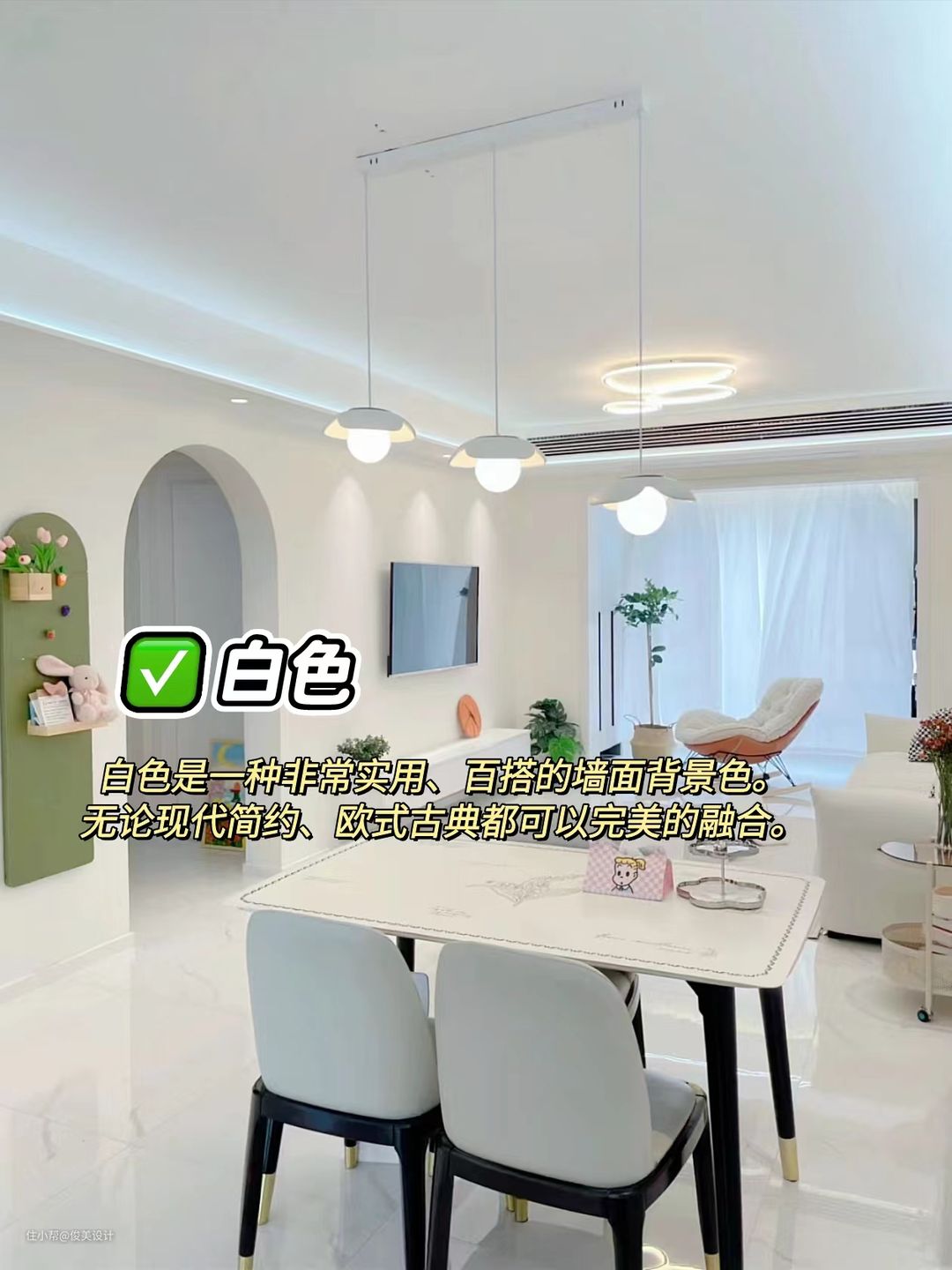 作为最经典颜色之一,白色墙面简洁大方,适合各种风格的装修。它不仅能营造明亮、宽敞的视觉感受,还能与其他色彩搭配得相得益彰,是永远不会出错的选择。
