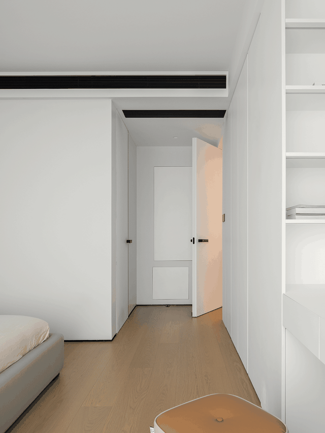 在次卧设置衣橱及写字桌,追求简约极致的平衡,同时满足了功能与形式并存的需要。