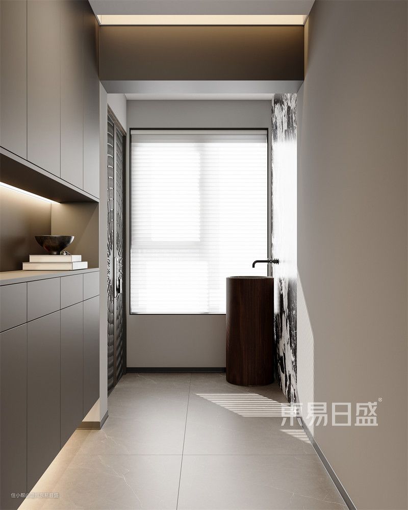 门处设有圆形洗漱台,右侧为一排浅灰色的橱柜,中腰处放置书籍和物品,提供便捷的收纳空间。室内自然光透过窗户洒入,使空间更加通透明亮。整体设计简洁大方,突出实用性和美感,营造出舒适宜人的入门氛围,展现现代生活的品质和时尚感。
