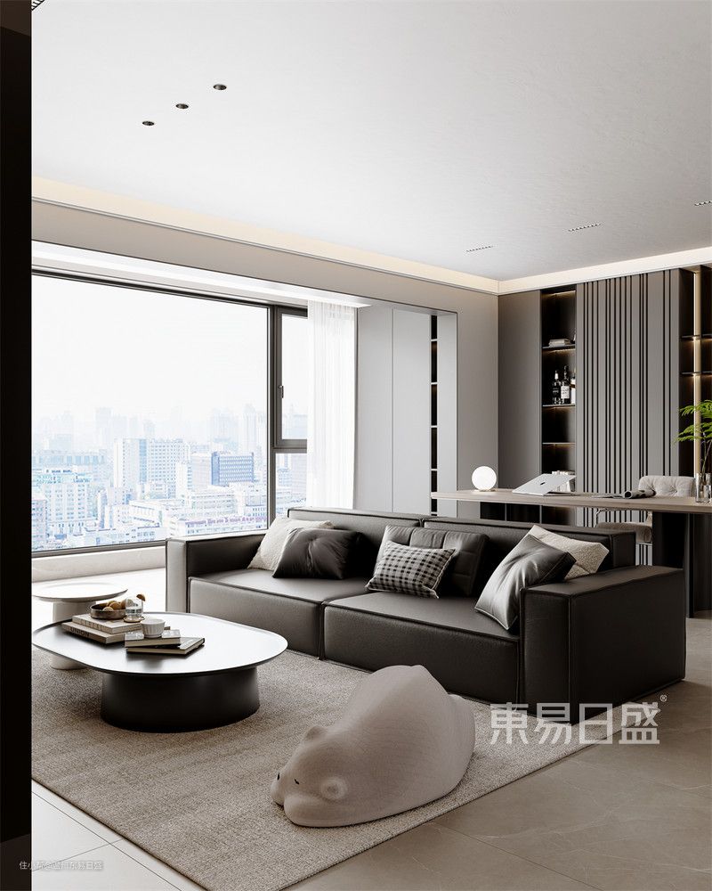采用浅灰地毯,搭配黑色椭圆茶几和白色小圆形茶几,营造出简洁而时尚的空间感。深色皮质沙发置于开放式空间,与阳台一体化设计,增加室内宽敞感。多功能区集成在客厅,提供舒适便捷的生活体验。整体设计简约而现代,展现时尚与舒适的完美结合。