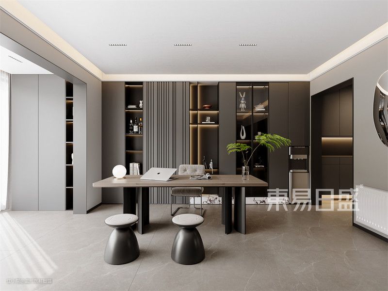 现代风格的多功能区设计旨在创造实用和舒适的空间。中心摆放着一张大型的浅色桌子,用于放置书籍、办公用品和绿植。背景装饰着黑色的一体式书架,上面陈列着装饰品和书籍。整体色调以白色和灰色为主,营造出简洁明亮的氛围,给人一种清爽舒适的感觉。这样的设计不仅满足了工作、学习和休闲的需要,还展现了现代生活的便利与美好。