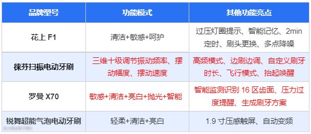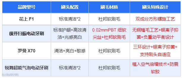 根据以上选购要素,我这次挑选了花上F1、徕芬扫振电动牙刷、罗曼X70、锐舞超能气泡电动牙刷这4款来做多维度测评,看看他们的清洁效果及效率、护牙护龈力、刷头适配度、功能模式、充电续航表现到底如何!