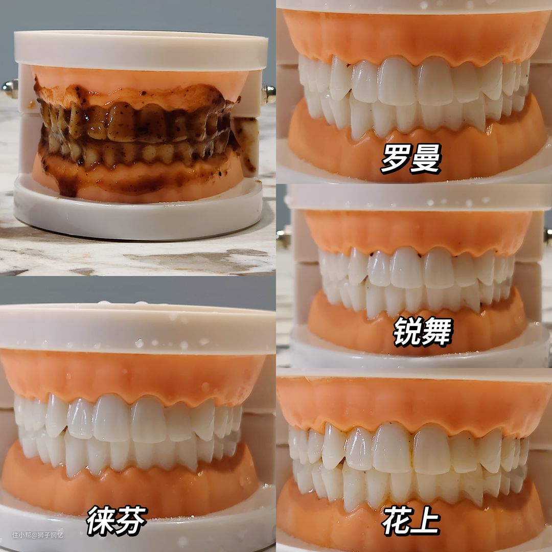 可以很直观地看出,同样时间内徕芬的表现会更胜一筹,假牙的牙间隙和牙缝这些死角几乎没有明显残留酱汁,科学认证报告得出的93.5%的有效清除率确实做到了,而另外三款都有不同程度的残留,这也跟他们的清洁性能相关。
