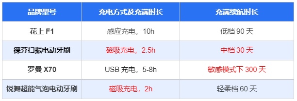 花上采用的是感应充电,充满电需要10小时,平时忘性大的话建议准备个备用牙刷。罗曼充电也偏长,充满后敏感模式下可以用300天,可能会比较适合牙齿敏感人士用,不用频繁充电。